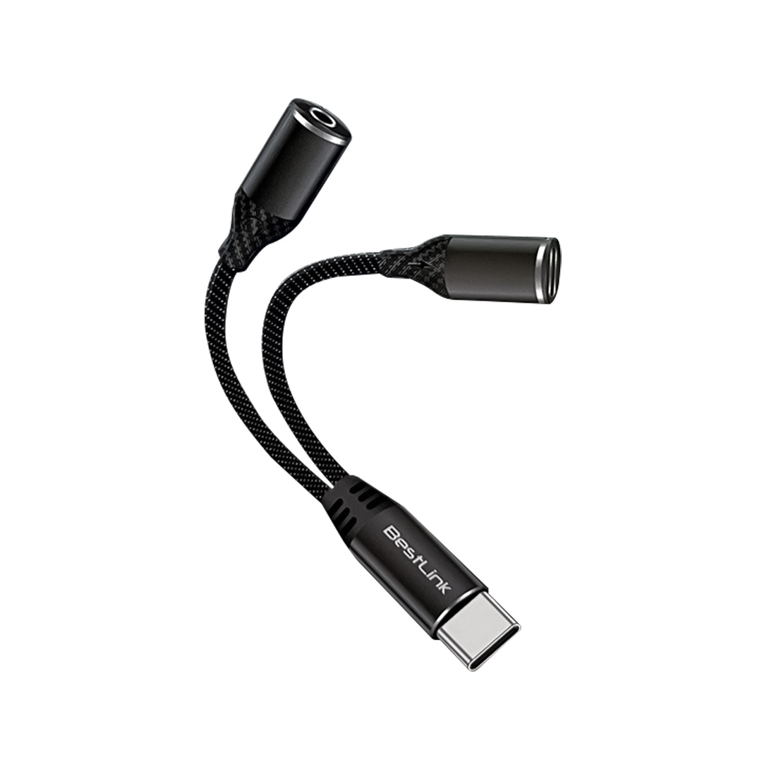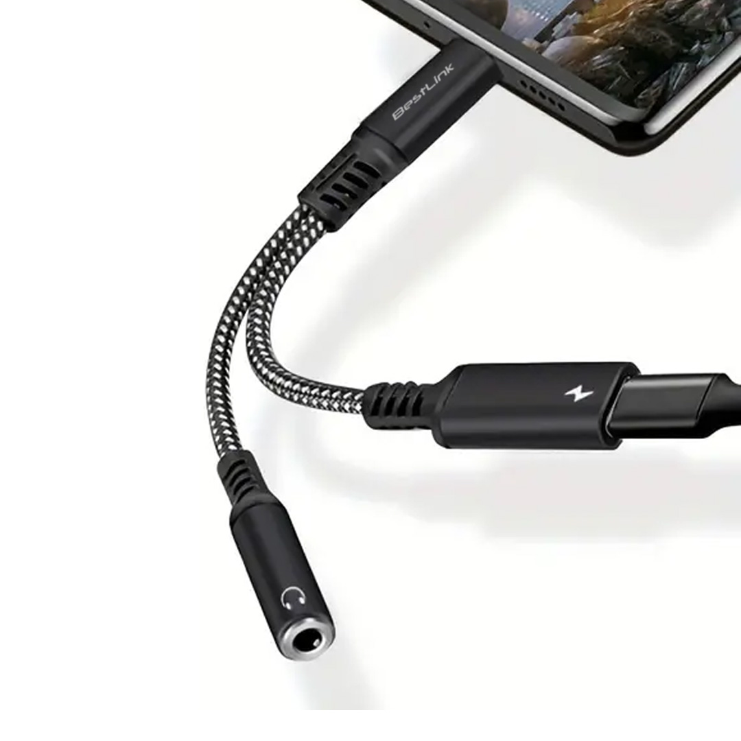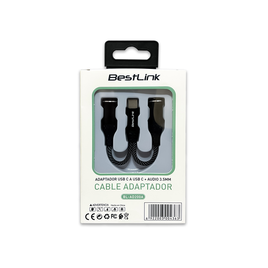 El adaptador USB C a USB C + audio 3,5mm. modelo BL-AD200A. Estilo en Y, le permite usar auriculares tradicionales a su vez, manteder cargando el smartphone. Cuenta con conectores metálicos, mayor vida útil, cable de alta calidad. El cable está hecho de material Alambre trenzado duradero y flexible.