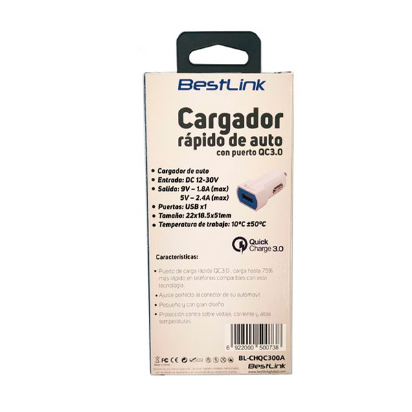 Cargador de auto un puerto USB de carga rápida QC3.0 / BL-CHQC300A